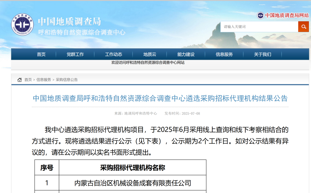 我公司中標“中國地質調查局呼和浩特自然資源綜合調查中心遴選采購招標代理機構項目”
