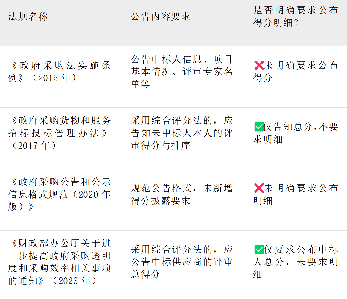 政府采購的信息公開要求逐步完善,近年來相關(guān)政策對得分公告的規(guī)定也在不斷調(diào)整。以下是相關(guān)法規(guī)的對比分析: